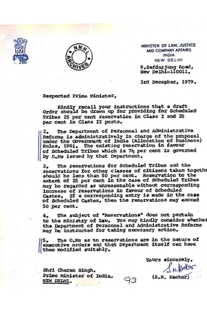 After the breakup of the Janata government, Charan Singh became the fifth Prime Minister of India on 28 July 1979 as head of a short-lived coalition. In the short period, he took concrete measures to bring about reservations for the BCs. Singh’s letters to the Deputy Prime Minister YB Chavan and SN Kacker, then Minister of Law, Justice and Company Affairs, both dated 3 December 1979 talk about the proposal for 25% reservation for backward classes in central class I and II services to be immediately taken up in the cabinet meeting the other day. Singh also firmly believed that children of government officers should be ineligible for selection for government posts.